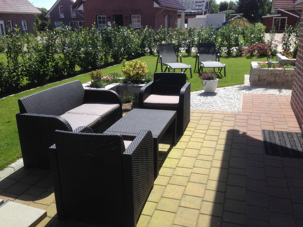 Der Essbereich beinhaltet einen 90cm x 180 cm großen Esstisch mit 6 Rattan- Stühlen (Kinderhochstuhl ebenfalls vorhanden).